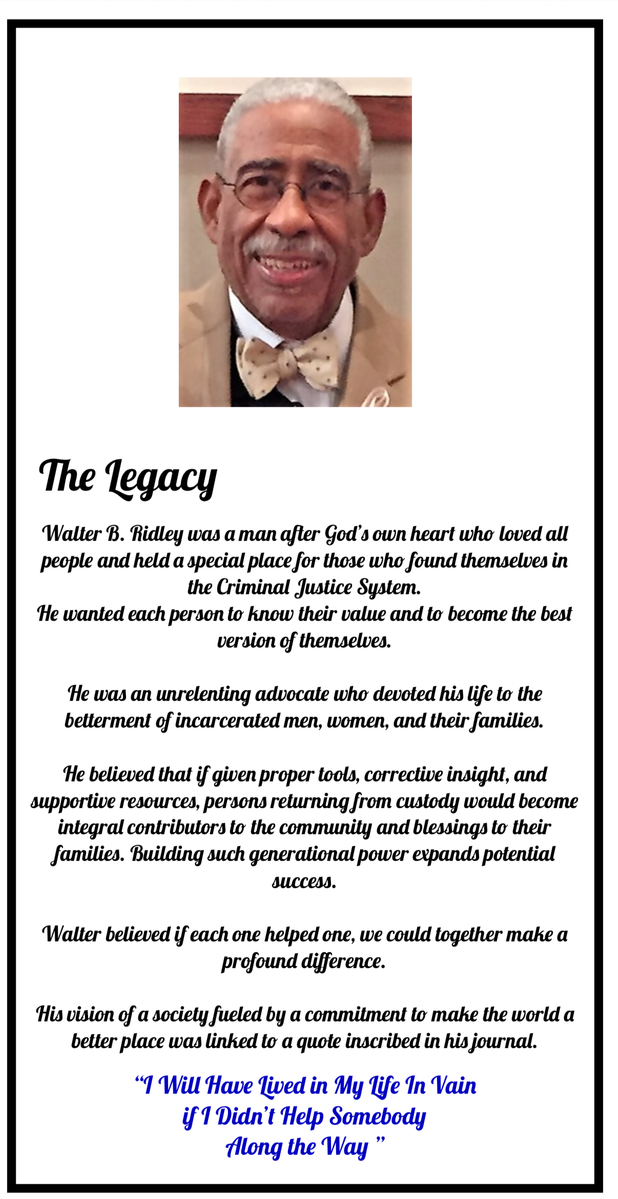 WBR Empowerment Legacy Foundation, Inc. was originally established in 2015 by Walter B. Ridley, former Director of the DC Department of Corrections and a lifelong advocate for dignity, justice, and rehabilitation. In 2019, the Foundation was reestablished and expanded under the leadership of his daughter, Ghia Ridley Hobbs, to carry forward his vision.